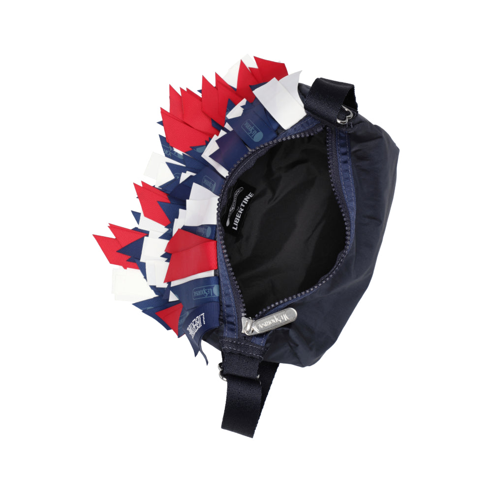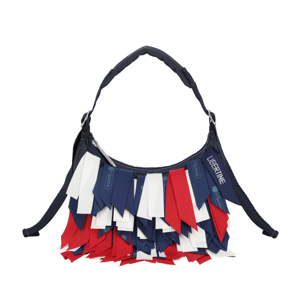 LeSportsac 攜手美國洛杉磯品牌LIBERTINE 推出最新一波聯名系列,藍白紅鮮豔配色流蘇,刻有「LeSportsac」和「LIBERTINE」標誌。