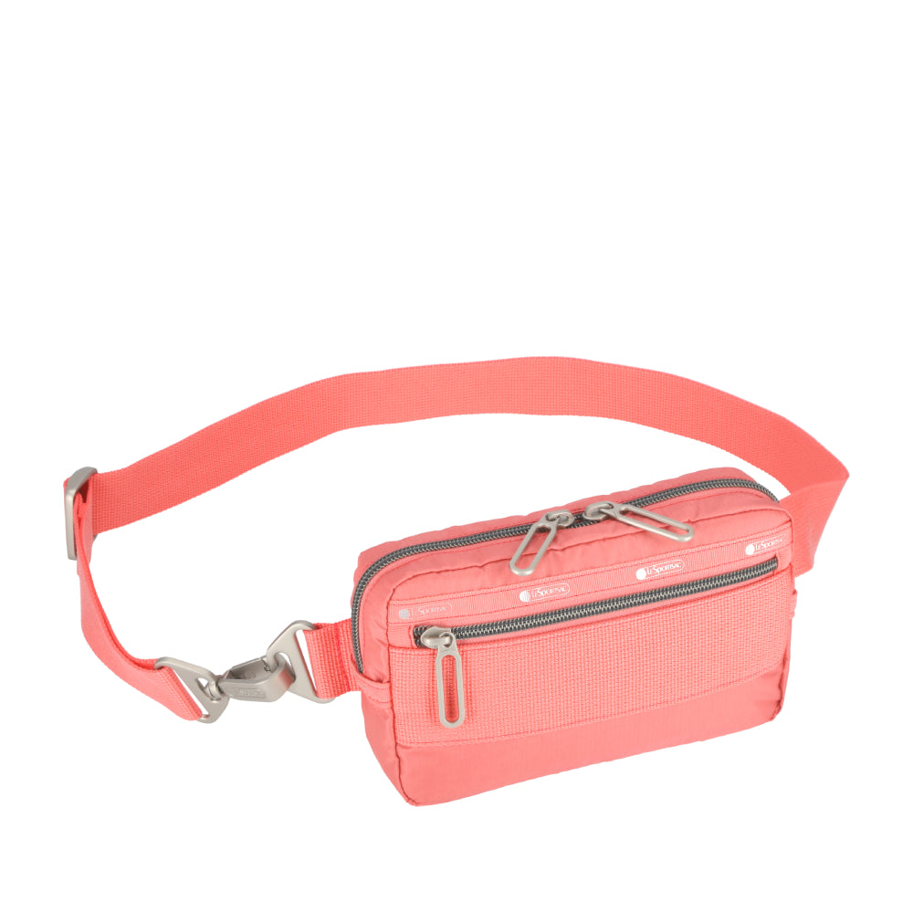 方形腰包亦可斜背,雙向拉鍊,可放入智慧型手機、迷你錢包、鑰匙等,適合在城市間穿梭,也適合旅行外出使用的包款。